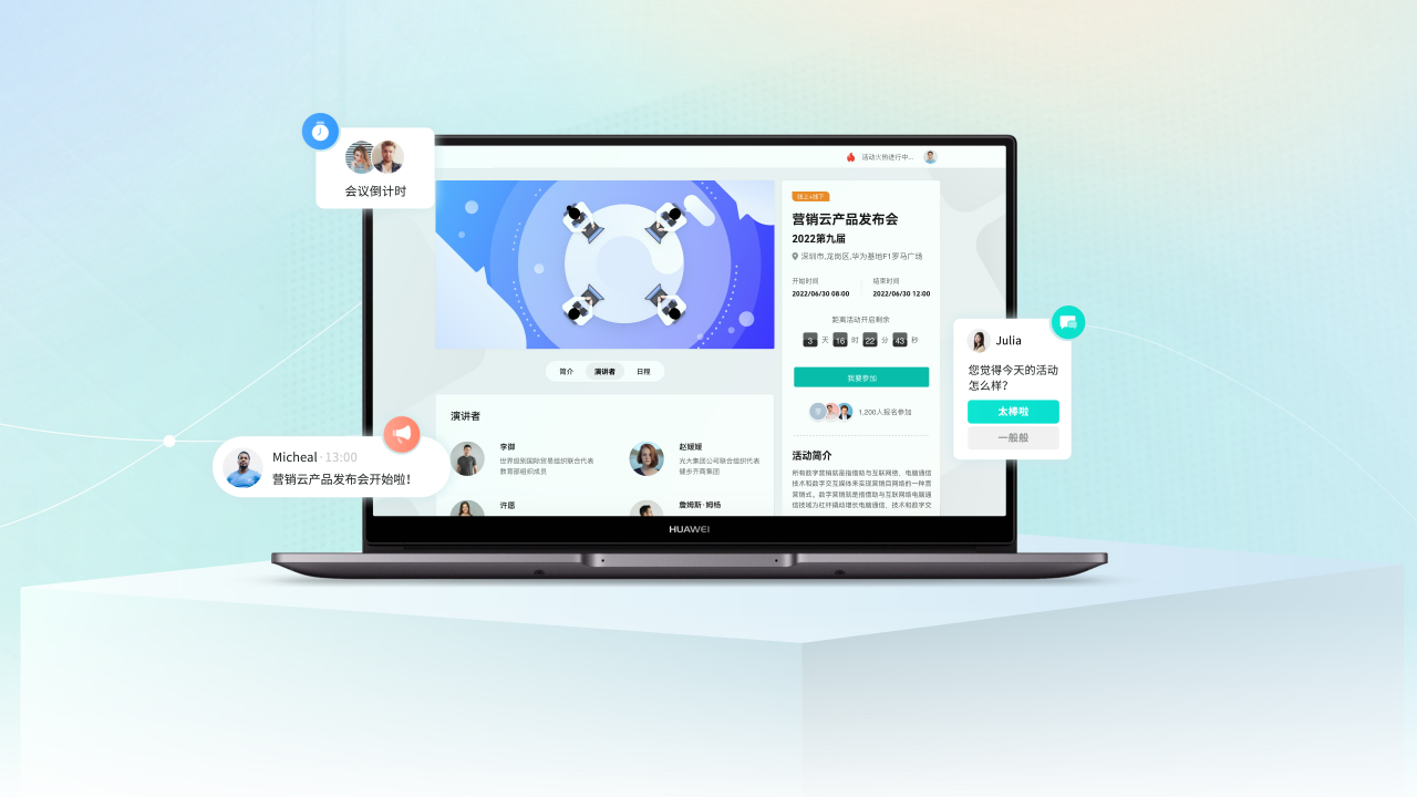 華為(wèi)Attendee數(shù)字活動平台提供了(le)面向效果的(de)數(shù)據分(fēn)析和(hé)客戶觸達能(néng)力,整合多(duō)樣渠道(dào)和(hé)流量入口,基于華為(wèi)自(zì)身(shēn)優勢,幫"助企業(yè)實現(xiàn)多(duō)渠道(dào)推廣和(hé)觸達。這(zhè)個(gè)功能(néng)可(kě)以幫助企業(yè)更好(δhǎo)地(dì)了(le)解客戶需求,提高(gāo)客戶滿意度和(hé)忠誠度。